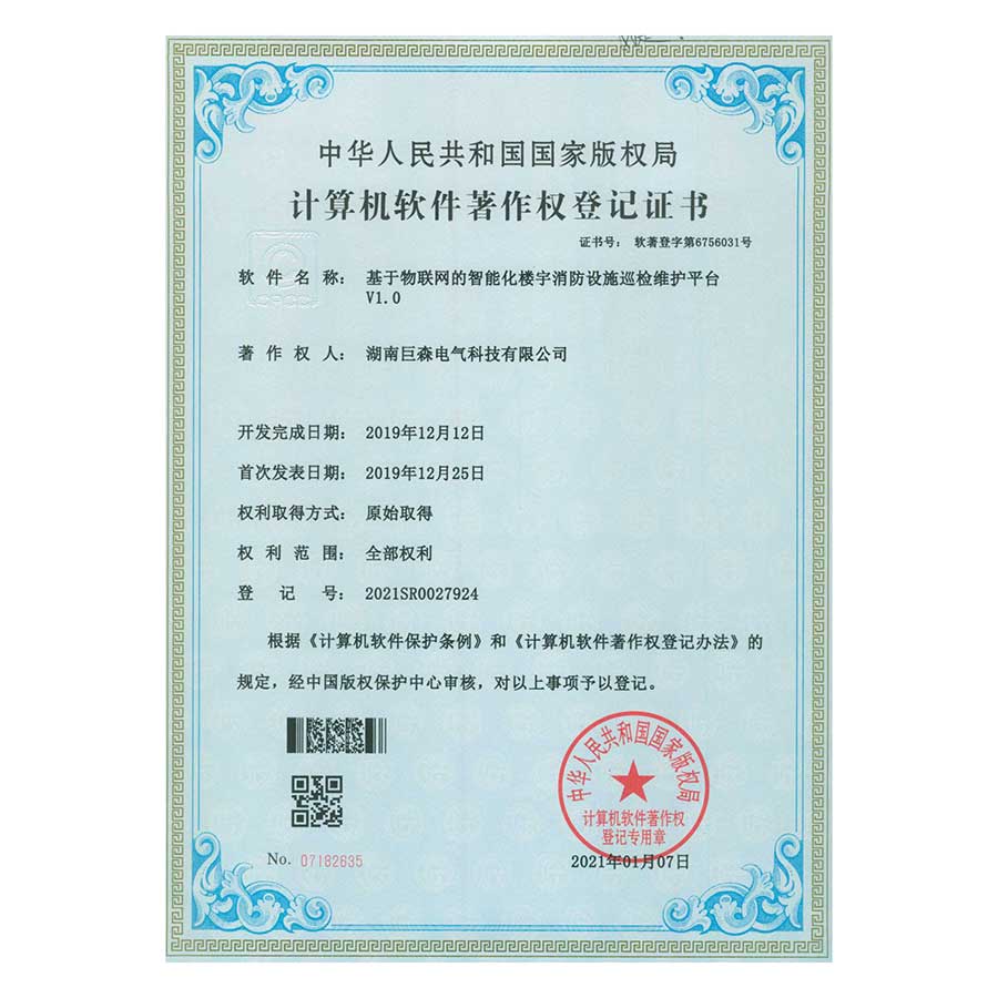 計(jì)算機(jī)軟件著作權(quán)登記證書-基于物聯(lián)網(wǎng)的消防設(shè)備巡檢維護(hù)平臺(tái)V1.0
